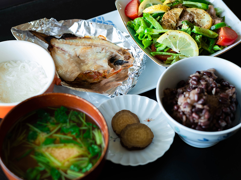 主食、主菜、副菜をバランス良く組み合わせ、様々な種類の食品を少量ずつ取り入れることが理想的です。